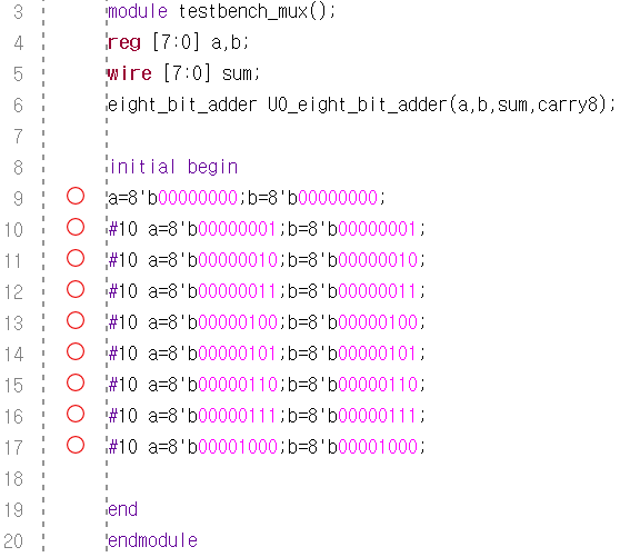 다음 코드와 같이 인풋값인 a,b를 8비트로 선언하고 덧셈의 결과인 sum또한 8비트로 받았다.