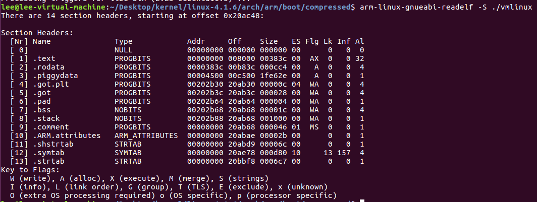 vmlinux의 section 정보들을 확인해보면 해당 section들에서 결국에 zImage는 .text 부터 .pad section만 남게 된다.