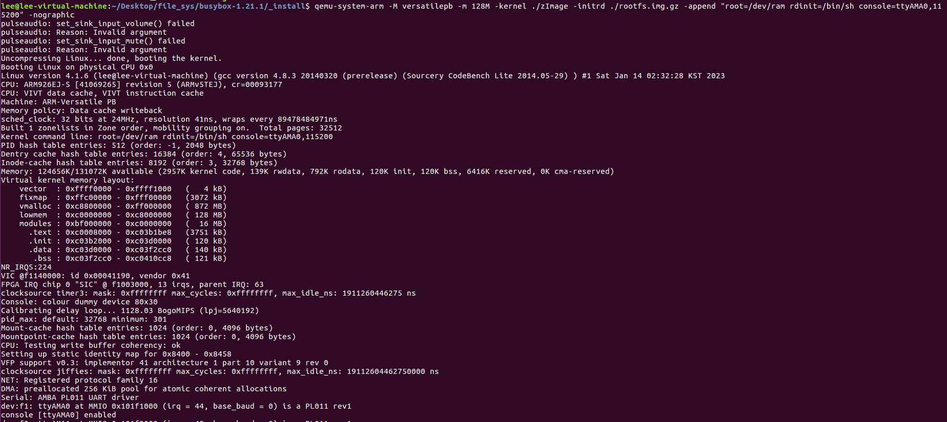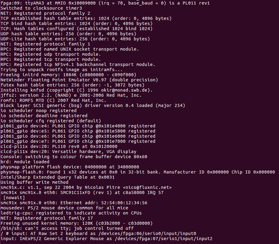 $ qemu-system-arm -M versatilepb -m 128M -kernel ./zImage -initrd ./rootfs.img.gz -append "root=/dev/ram rdinit=/bin/sh console=ttyAMA0,115200" -nographic