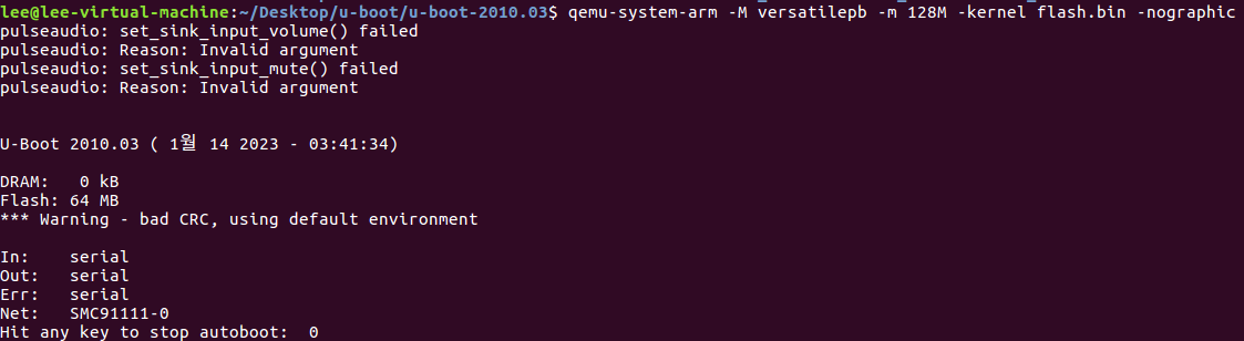 마지막으로 다음 명령어로 flash.bin을 qemu로 돌리면