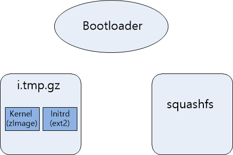 즉, 구조의 Diagram을 그려보면 다음과 같이 Bootloader가 존재하고 i.tmp.gz 안에 Kernel과 ext2 파일 시스템이 별개로 존재하는 것이다.