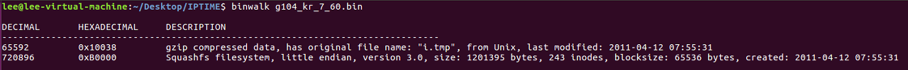 binwalk로 펌웨어의 구조를 살펴보면 0x10038까지는 bootloader x0010038 이후에는 gzip으로 압축된 Kernel로 이루어진 것을 알 수 있다. 또한 0xB0000부분 부터 Squashfs 파일시스템으로 구성된 것을 볼 수 있다.