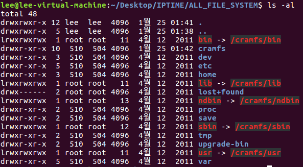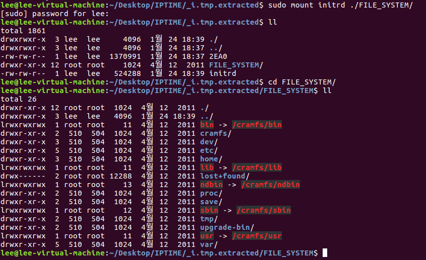 initrd를 새롭게 생성된 FILE_SYSTEM 디렉터리에 mount를 진행하면 filesystem 형식과 같은 파일들이 나오는것을 볼 수 있다.